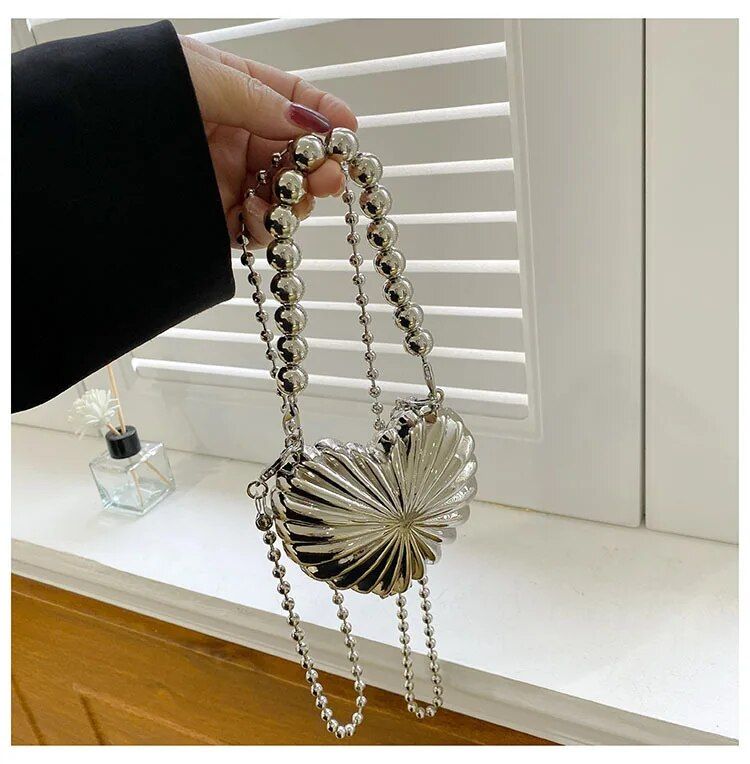 Introducing our latest obsession – the Luxury Pearl Beaded Metallic Heart Crossbody Bag. A symbol of sophistication and high fashion, this bag is designed for the modern woman who appreciates elegance in compact sizes. Crafted with an exquisite metallic finish and adorned with pearls and chains, this mini heart-shaped handbag is more than an accessory; it’s a statement.
